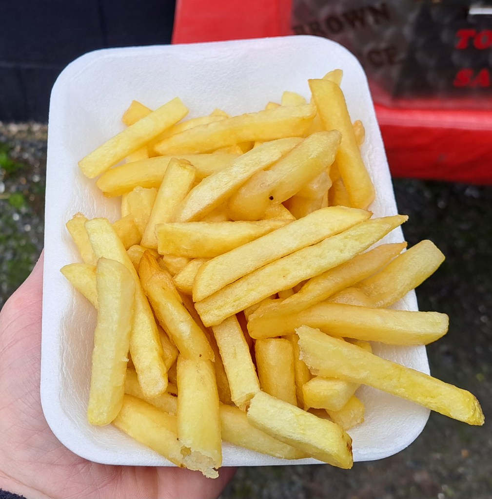 Great to have chips again, they were a good portion, tasty, golden, firm to soft inside, and but for the fact that they were only warm they could have been the chips of the year, score 73.