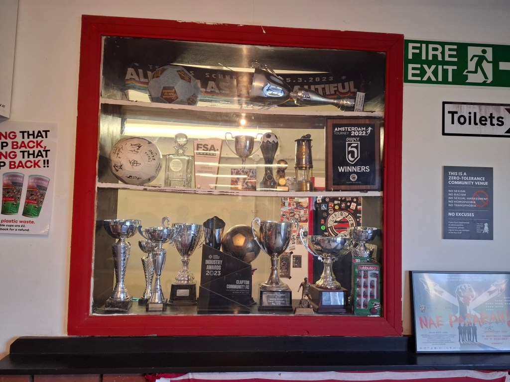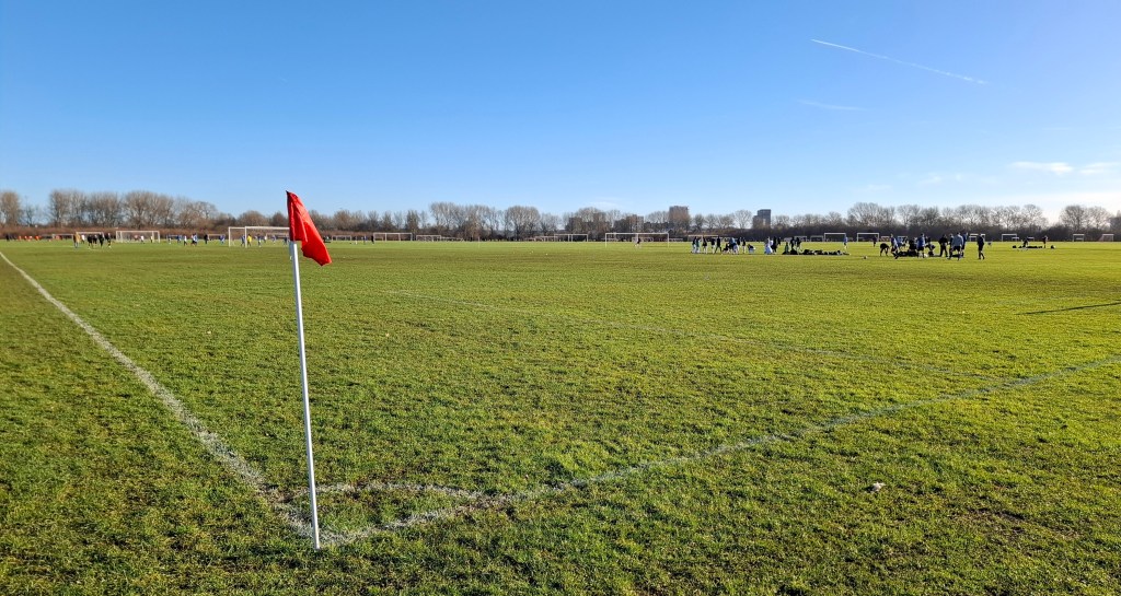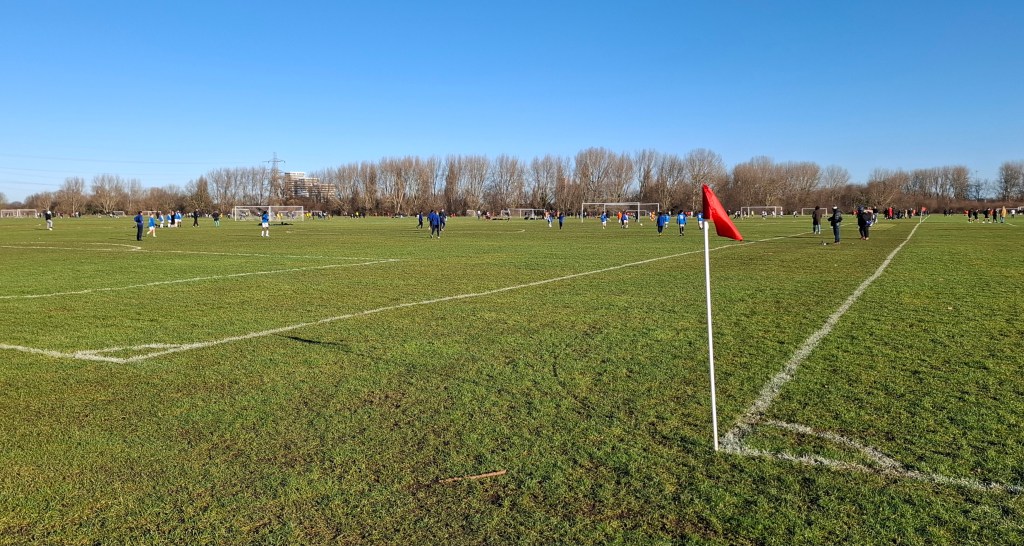 The grass pitch bore the scars of a wet winter with muddy patches showing through but the recent warmer, drier days, made the pitch look good compared to my recent visits. The cricket pitch beyond the open side looked magnificent and even tempted me to visit in the summer to watch a game.