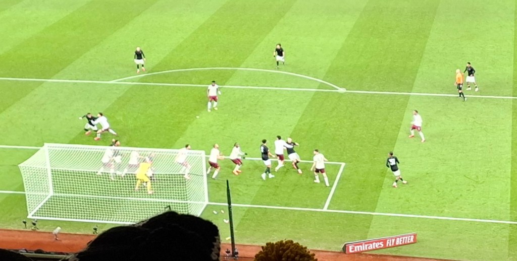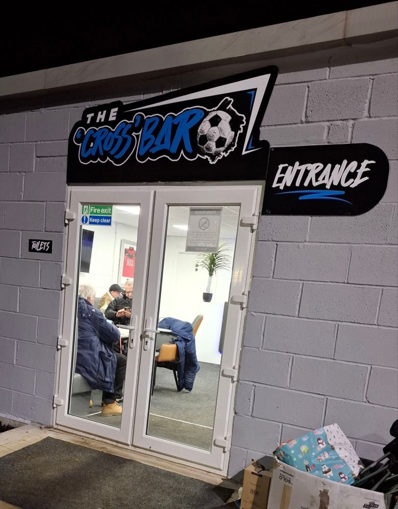 The ground has an immaculate flat grass pitch and is open on three sides with hard standing. The third side is the large main stand with changing and training rooms underneath. The long bar area is glass fronted and you could watch the game from inside if you wished. A good idea on this drizzly, wet, damp, grey, cool day. Although we sat outside on some damp seats.