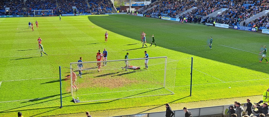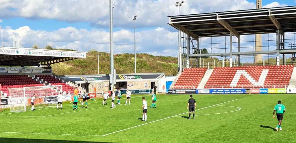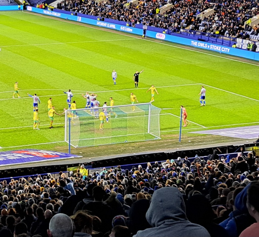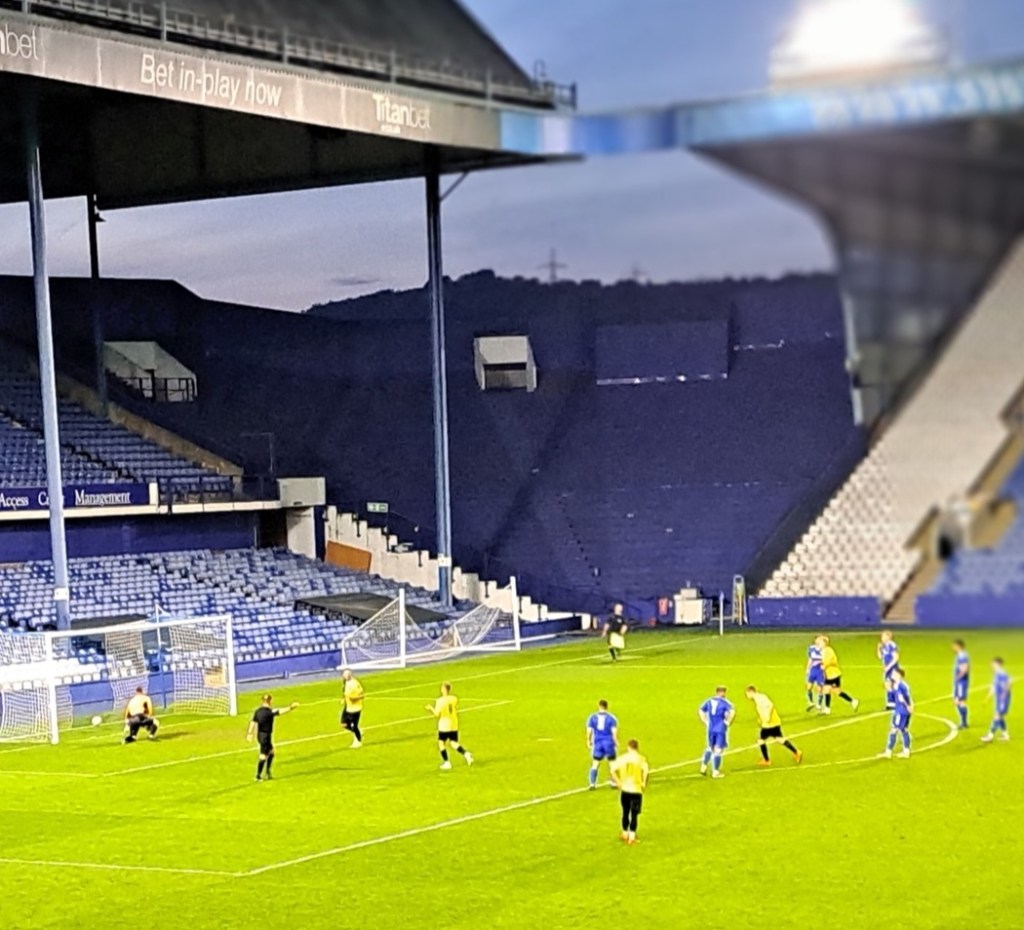 A good humoured crowd of above 1000 turned up with the fans of the more senior team, Worksop the noisiest. It was only a mild noise compared with the febrile atmosphere of the last time I was at Hillsborough when they were battling for survival in the Championship. The kickoff had been scheduled for 19.30 but Worksop had put 19.45 on their Social Media so the game was delayed to give everyone time to arrive.