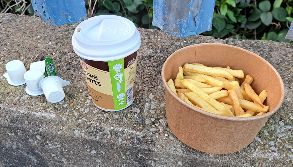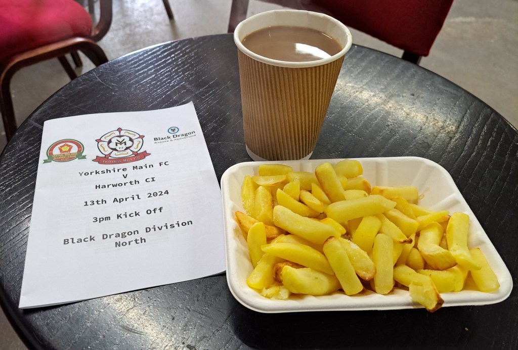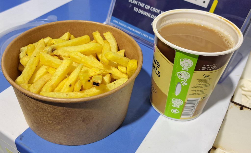 The chips were good, hot, hot, a good quantity, tasty, good texture but a bit limp. They didn’t have the spicy taste that I experienced before at Hillsborough, I think because they were cooked in separate fat rather than cross contaminated with something else. A very good score of 69.