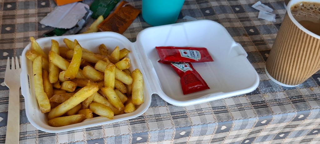 Despite the large crowd the two staff manning the food kiosk were working like lightening. My chips were a good portion, hot, golden, tasty, not greasy but very crunchy. Had the chips been cooked more than once? A score of 62.